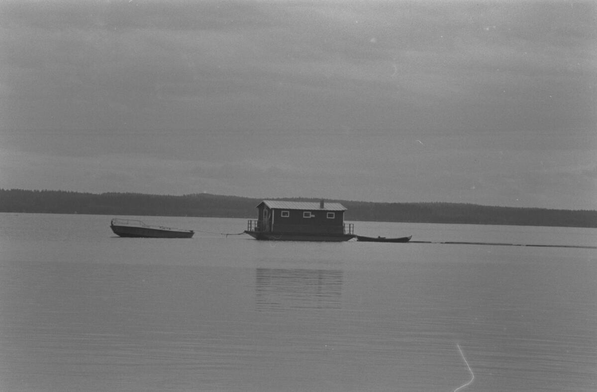 Bäckmyrviken. Radiostyrd båt med husbåt på släp, som är ytterst i bakläns.