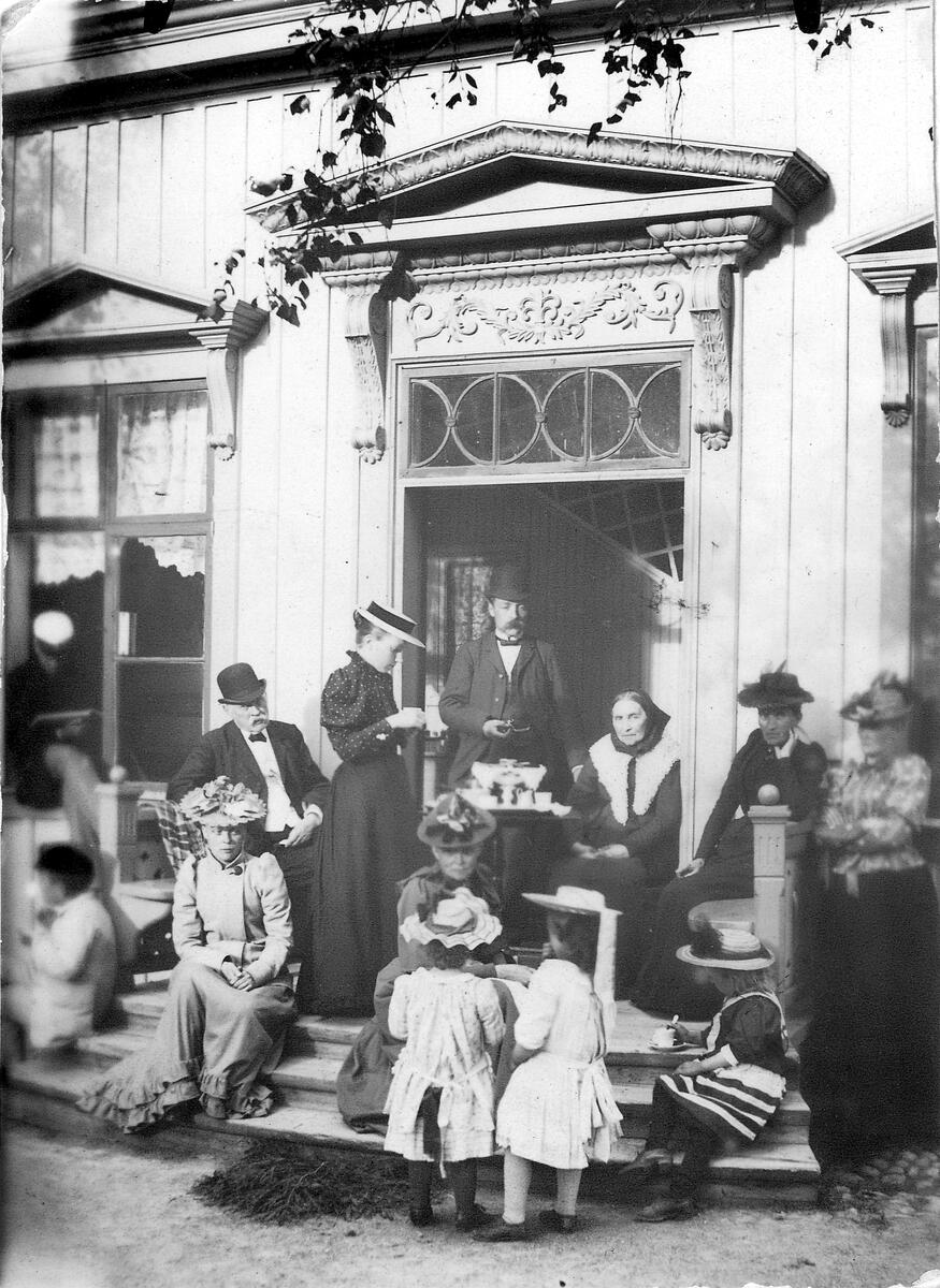 Hos lektor K. Arnell, Framnäs, stående i dörröppningen. Fru adj. E. Tjerneld sittande till höger på bänken.