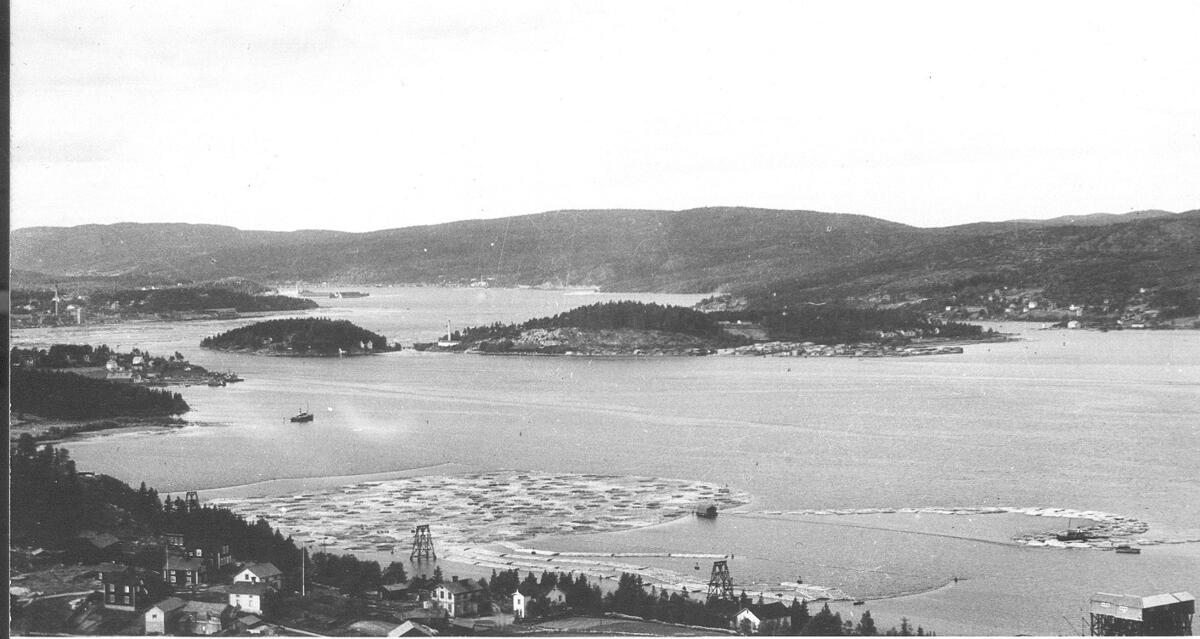 Vy över Sandö innan bron byggdes. Längst stranden nedtill på bilden syns linbanan som transporterade flis och sågspån från brädgården till Nensjö sulfatfabrik. Nere i högra kanten syns det ställe där linbanan ändrade riktning för att gå tvärs över viken till Nensjö.
