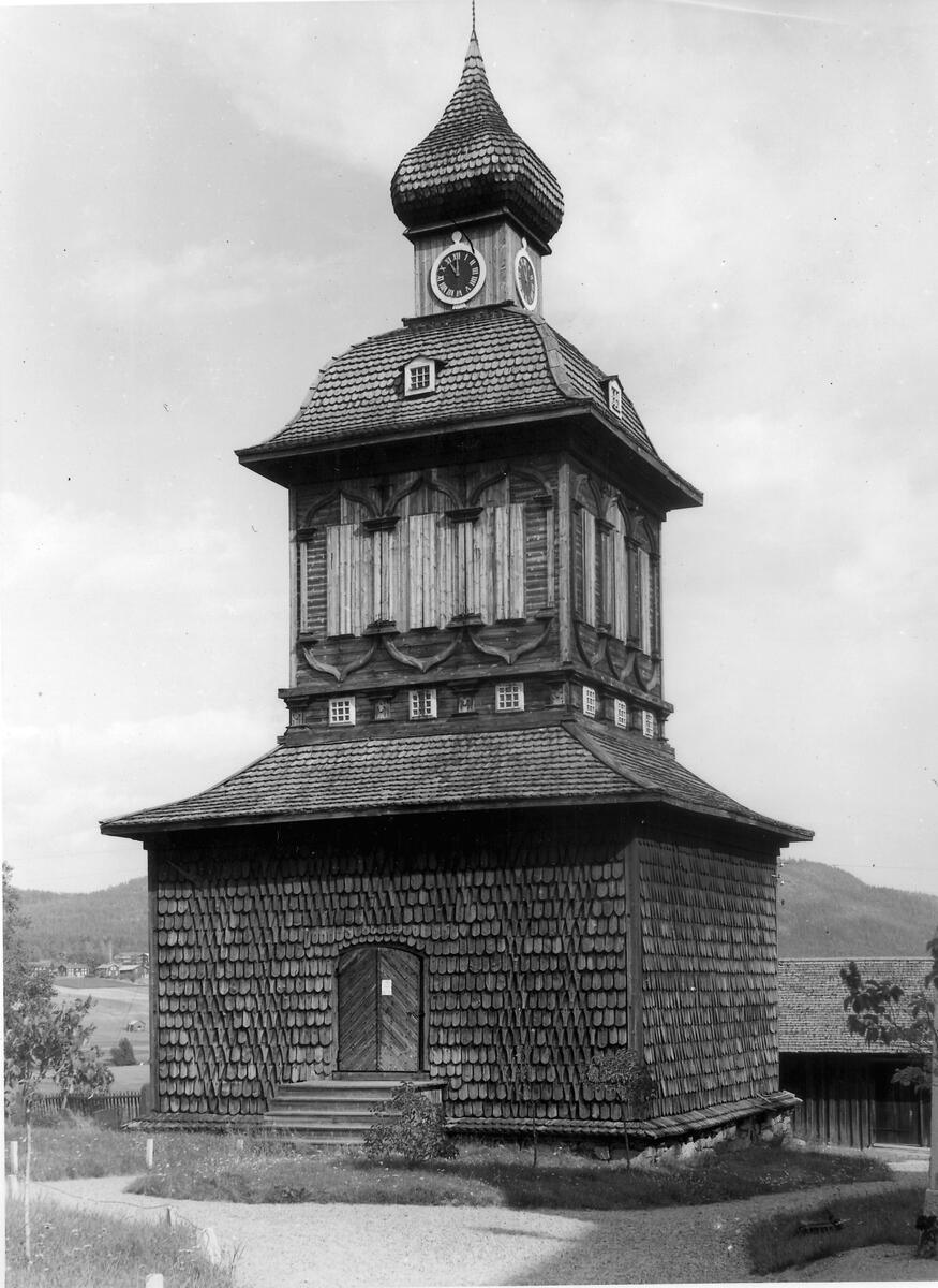 Klockstapeln klädd med spån är uppförd 1759 av Pehr Zackrisson i Kubbe.