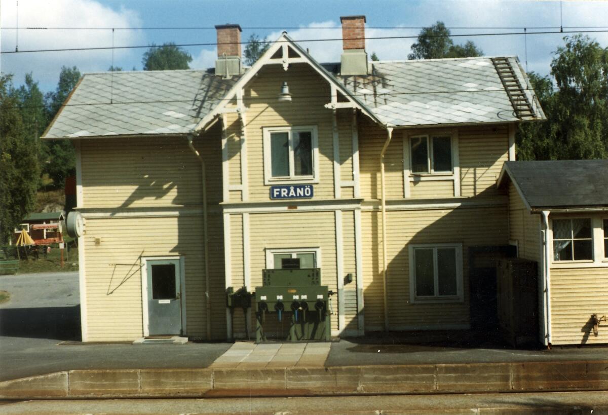 Frånö järnvägsstation. Stationen öppnades för trafik 12 december 1893. Otto Hugo Anshelm Ahl blev den första stationsförmannen. Godstrafiken var ibland ganska intensiv på grund av transporter till och från den närbelägna sulfitfabriken. Stationshuset revs 1976.