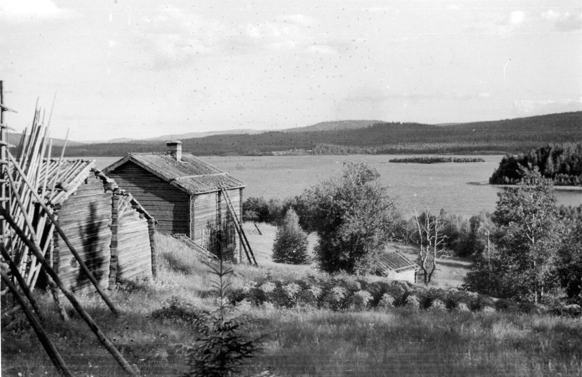 Utsikt över Myckelgensjön. I förgrunden loftboden (nr 21 enligt planen), färdstallet (nr 23) och undantags- eller förmånsstugan (nr 27).