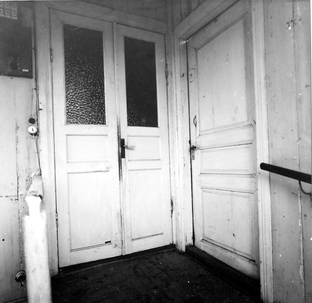 Interiör. En trappa till vänster sett från baksidan, Norra Kyrkogatan 16.