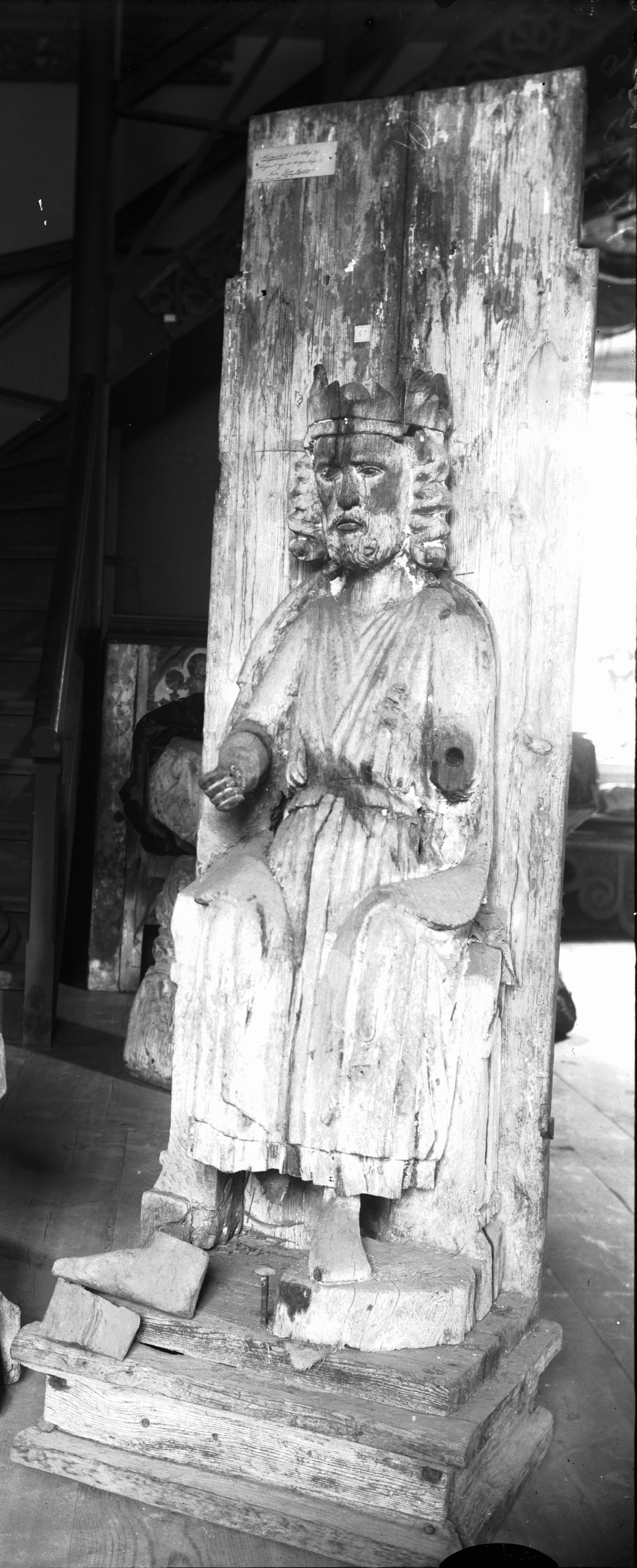Skulptur av trä framställande sittande Sankt Olof. Från 1400-talets förra hälft.