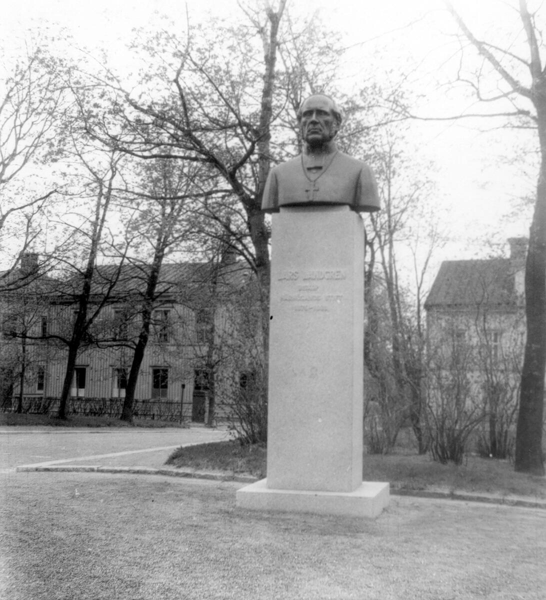 Titel: Byst av biskop Lars Landgren framför kyrkans huvudingång.