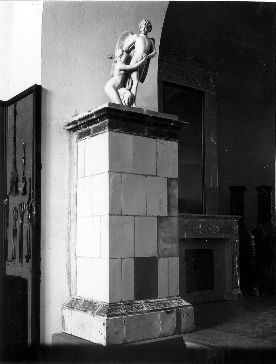 Plan ugn, sengustaviansk, vit med dekor i svart och guld. Krönprydnad: Sergels Amor och Psyche. Från hus i Stockholm.