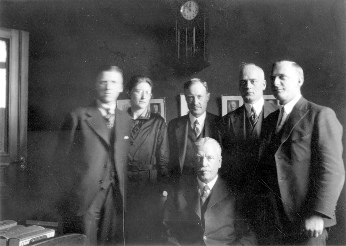 Från vänster Hjalmar Olsson kassör, Irma Lenander Kammarskrivare, Magnus Nordström kamrer, Bengt Kron Registrator ,Nils Möller Kammarskrivare. Sittande Ragnar Forsman Direktör,3 0.11.1933