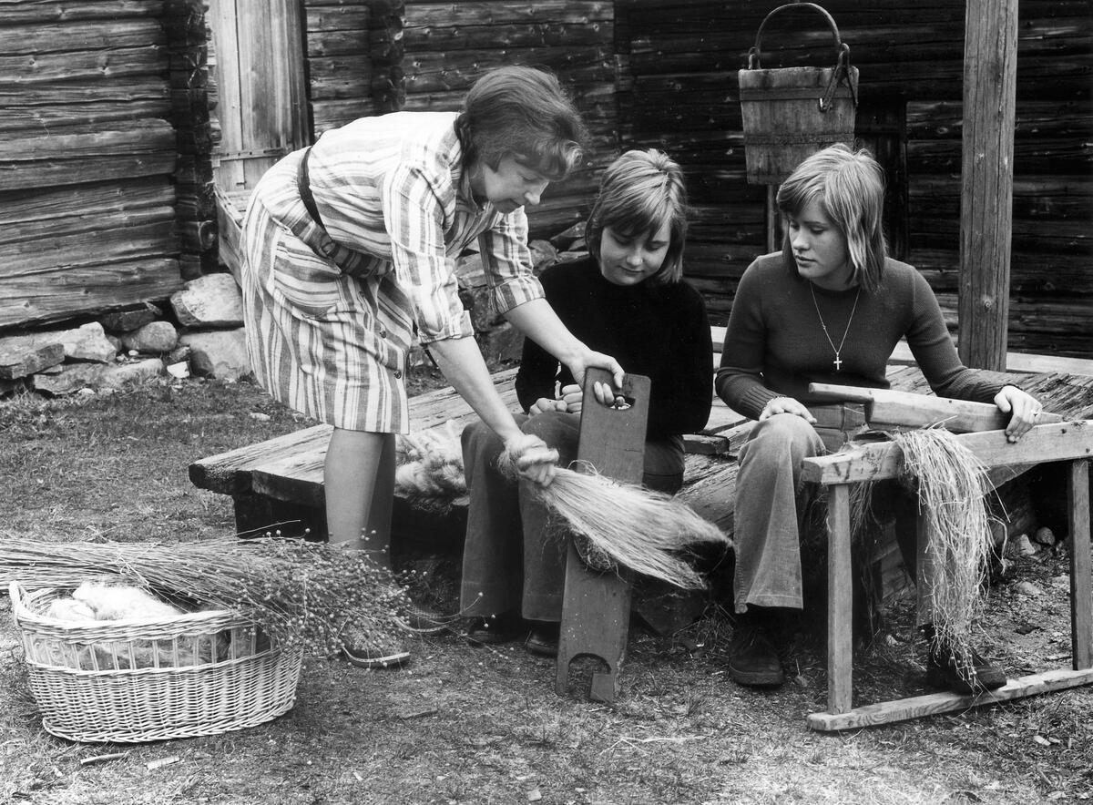 Elever ur klass 8, Franzénskolan, lär linberedning på Murberget. Linet häcklas till vänster och drages i en draga. En "knippe" steg-lin ligger ovanpå strykorgen. Stry = avfallet, det sämsta linet.