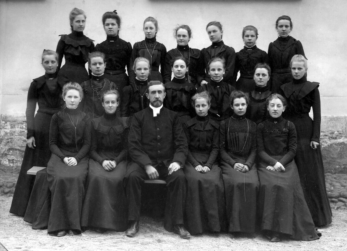 Konfirmander. Övre raden nr 3 från vänster Ellen Wahrgren, 9/10-1884 - 1956.; Test gåva av frk Ruth Wahrgren, Fristad, Härnösand. Prästen är Anders Josef Källander, född 1861 i Skara, död 1934 i Lovö, Stockholms län. Prästvigd 1890 för Härnösands stift och komminister i Härnösand 1896-1902. Ellen är syster med Aina och Nicklas Wahrgren som ritat alla stenhus i Sollefteå