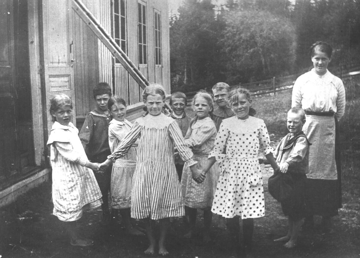Skolklass vid Träsk skola. Personer från vänster:; 1. Essy Edholm, fosterbarn hos Edholms 2. Manne Bergqvist, Träsk; 3. Märta Åsell, g med Alvar Fredriksson 4. Greta Nyholm, g Nyström ( Frånö).; 5. John Nyholm 6. Ester Nygren, (Essvik); 7. Axel Hägglund, Träsk 8. Hanna Bergkvist, Träsk; f. 1910 d. 1932.; 9. Jonny Ulinder 10. Fröken Berg från Bjärtrå.