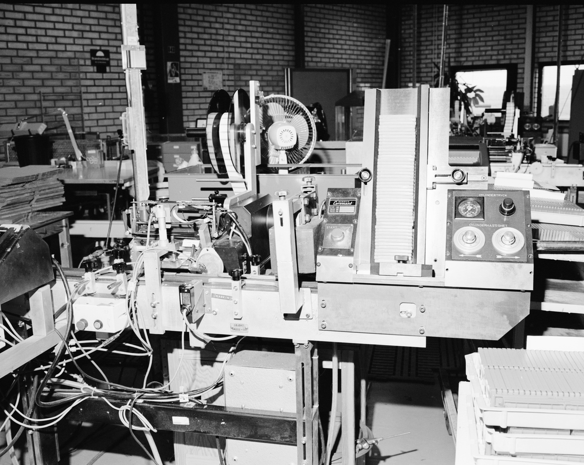 ETKETTERING-PAKETERING. Detaljbild som till höger visar inmatningsdelen med askar staplade.Askarna matas ned på ett transportband där etikett med för ordern akuell text tryckes fast på askens lock >>