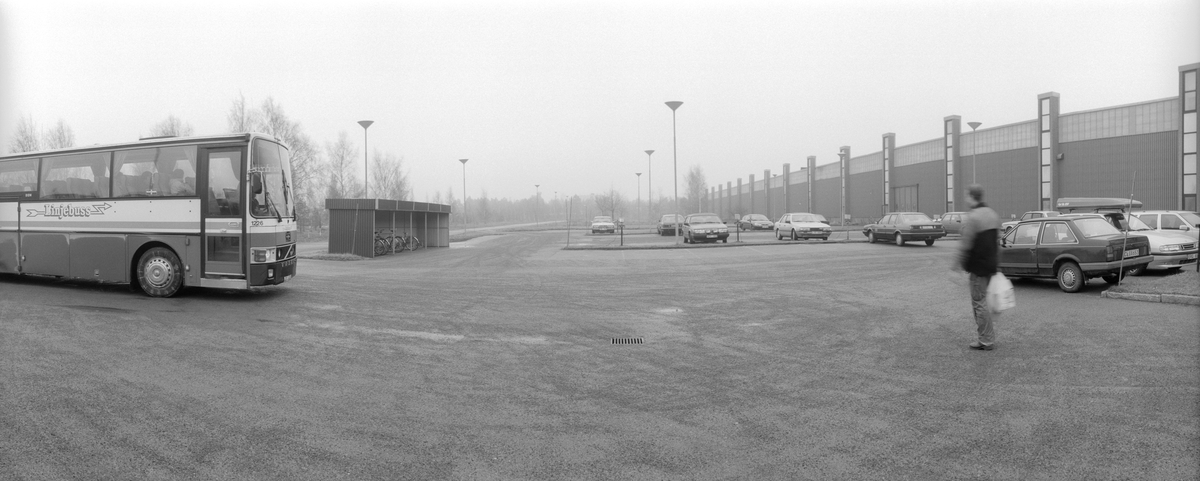 Exteriör. Buss hämtar arbetarna.