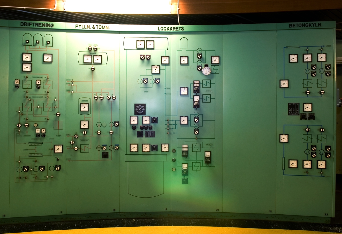 Bilden föreställer: Plan 6, kontrollrum 619. Närbild på reaktorpanel. Från vänster: Driftrening, fyllning och tömmning, lockkrets samt betongkyling. Förklaring av system framgår av rapport :Statens Vattenfallsverk A23/60 5/4 1960.