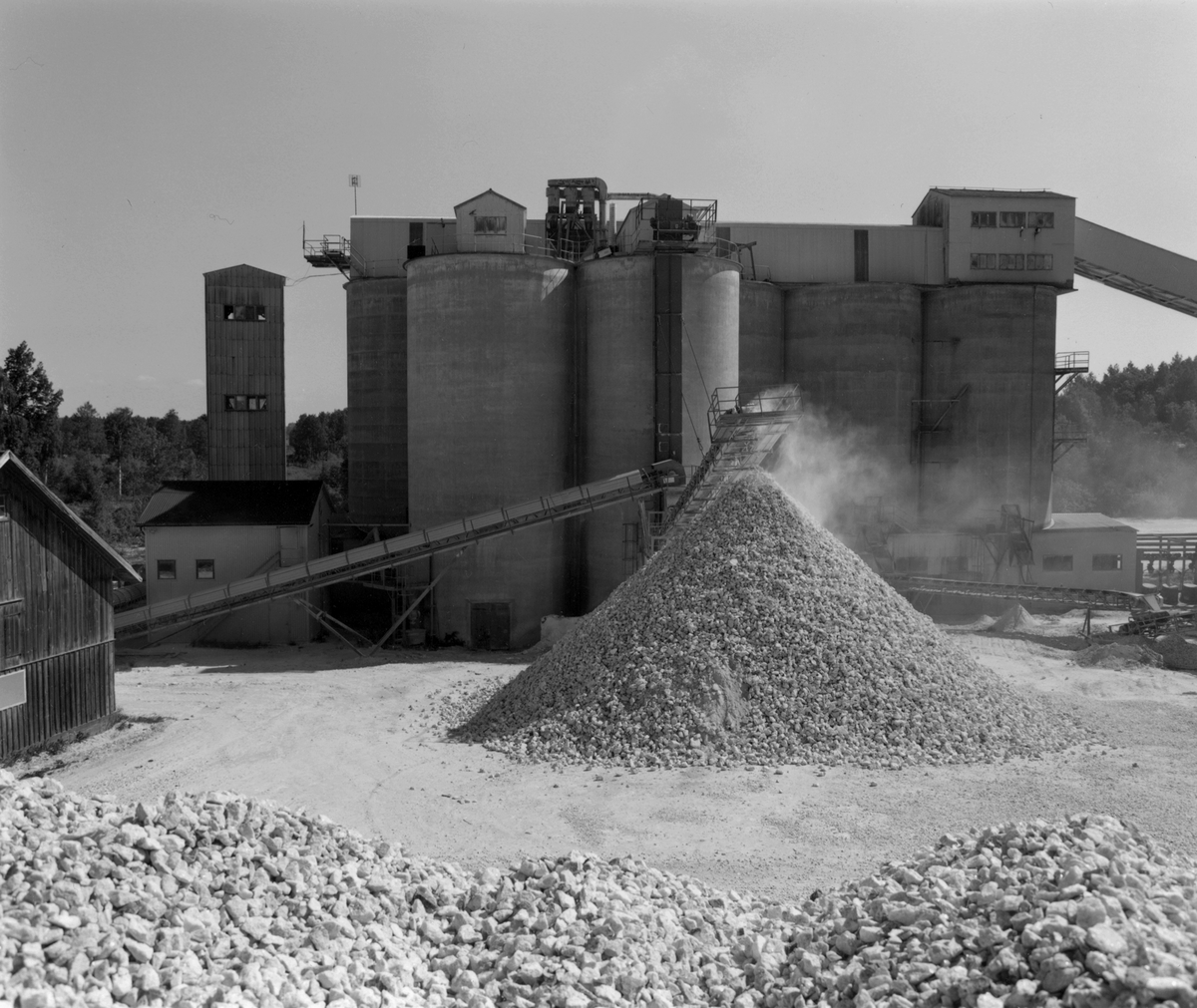 Kalklinbanan Forsby - Köping. Silosanläggning. I förgrunden en stenhög s.k. "Carbitalsten", dvs hand- sorterad för tillverkning av pigment för bestrykning av papper. Banden och elevatorn tillhör handsorteringen. Byggd 1990.