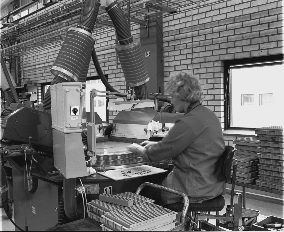 EGGBEHANDLING Operatören placerar skären på roterande spindlar vilka sitter monterade på ett rundmatningsbord. Vid rundmatningen kommer skären i kontakt med roterande borstar vilka åstadkommer eggavrundning runt hela skären. Efter ett varvs rotation av rundm.bordet plockas skären ur maskinen. >>