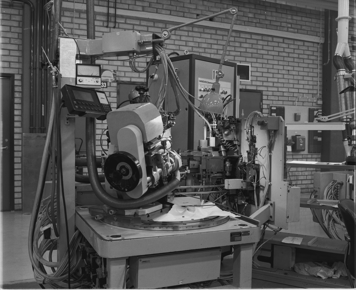 SLIPNING AV FRÄSSKÄR Översiktsbild av 3-spindlig Combifasmaskin. I bakgrunden syns maskinens styrskåp. Till vänster är manöverenheten placerad. >>