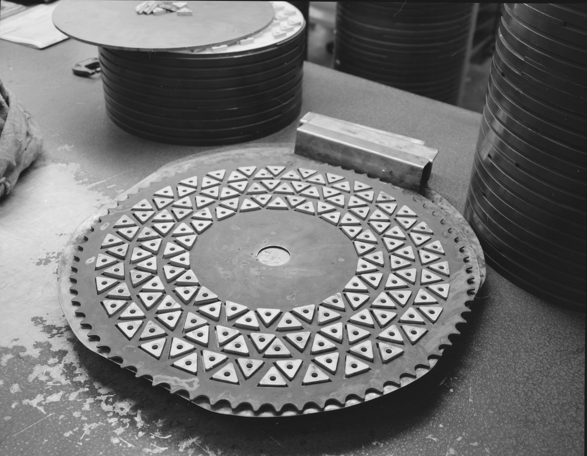 SLIPNING AV SVARVSKÄR. Detaljbild av medbringare med skär iplockade. Medbringaren lyftes och placeras därefter i maskinen. Se även bild med neg nr C 10368. >>