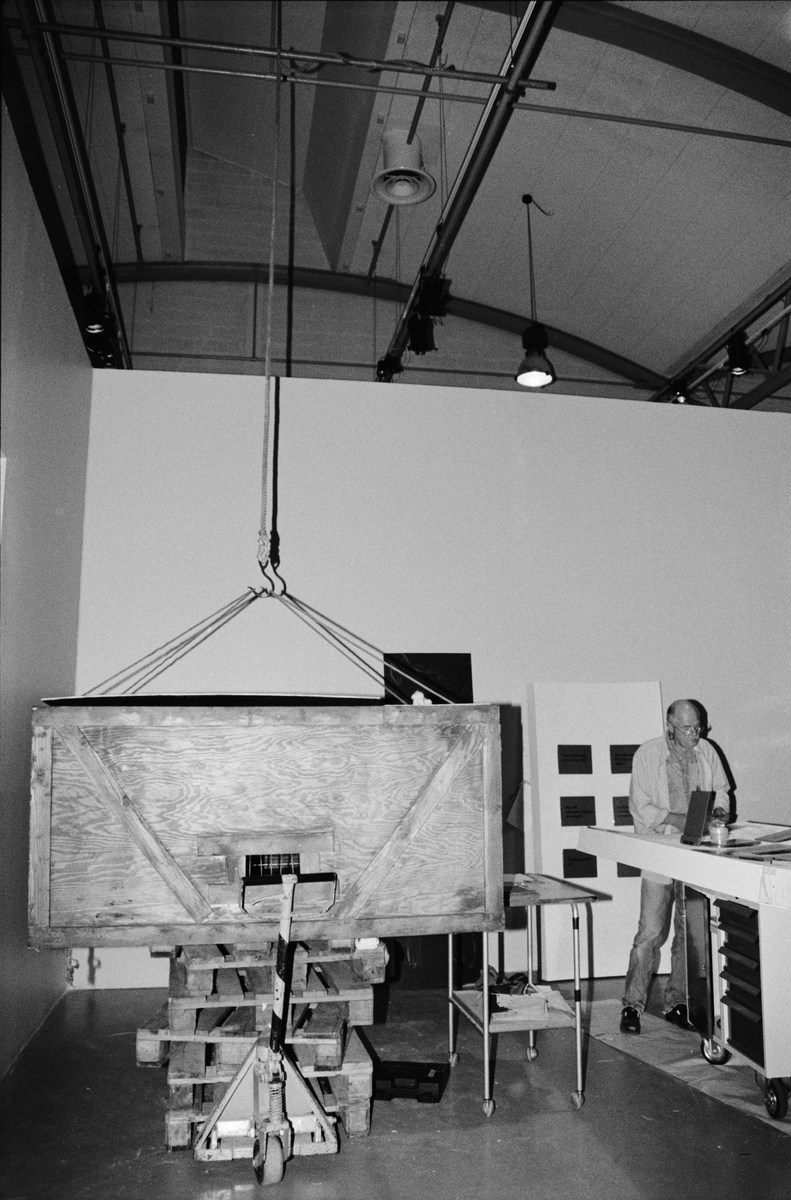 Uppbyggnad av utställningen "Teknik som talar alla språk". Spindellådan.