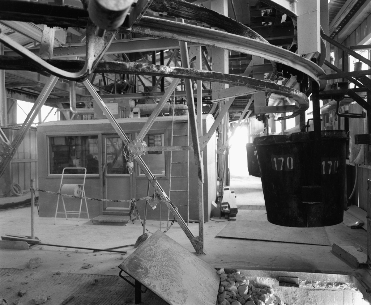 Kalklinbanan Forsby - Köping. Linbanestationen i Köping. Den uppfällda luckan är en reservutgång vid t.ex krossfel. Den används också när man bygger upp lager vid>> semesterstopp. Manöverkur i bakgrunden.
