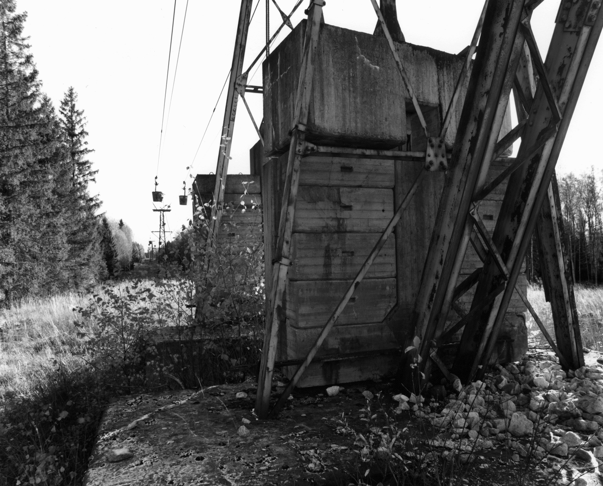 Kalklinbanan Forsby - Köping. Station Malmberga. Spännstation 6. Motvikter för spänning av bärkabel.