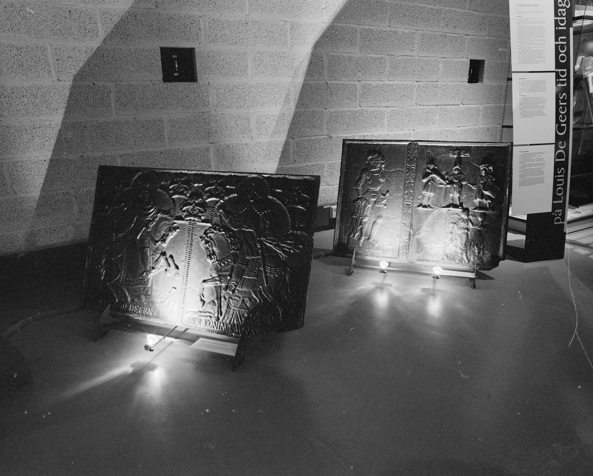"Vallonien på Louis De Geers tid och idag" utställningen. Spishällar i förgrunden spishäll föreställande Ludvig XIII och den svenske konungen Gustav Adolf.