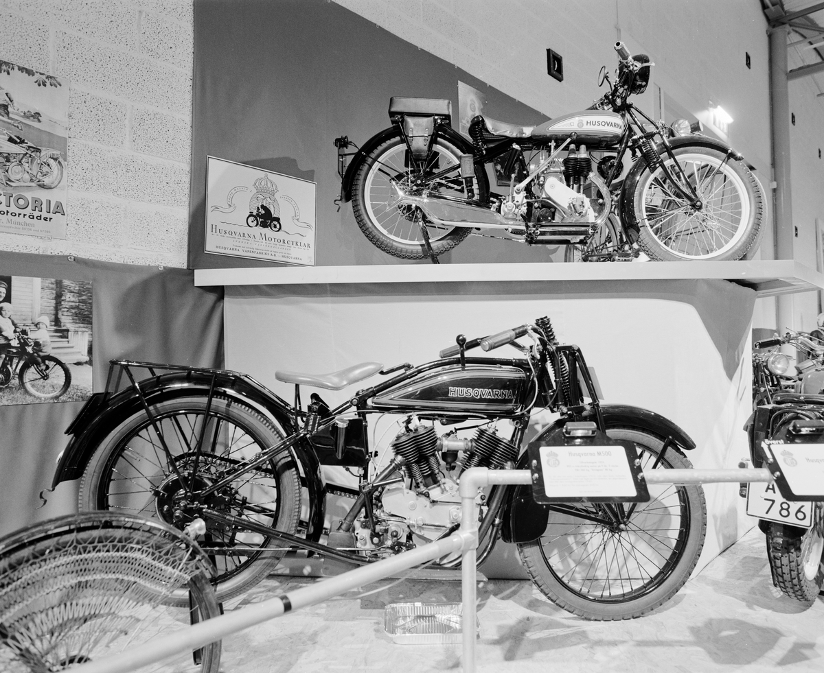 Dokumentation av "Motorcykeln 100 år" i Wallenberghallen. Motorcyklar, 2 st Husqvarna.