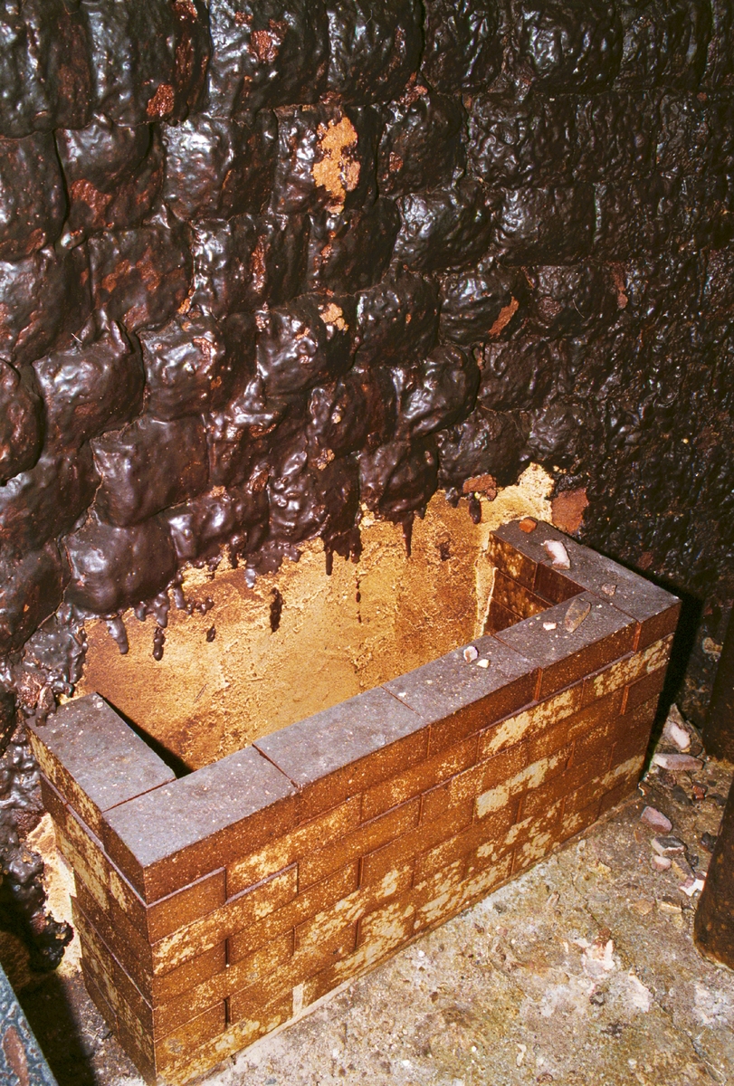 Nyrenoverat fyrhål inne i ugnen. På väggen en blandning av stelnat sot och salt.