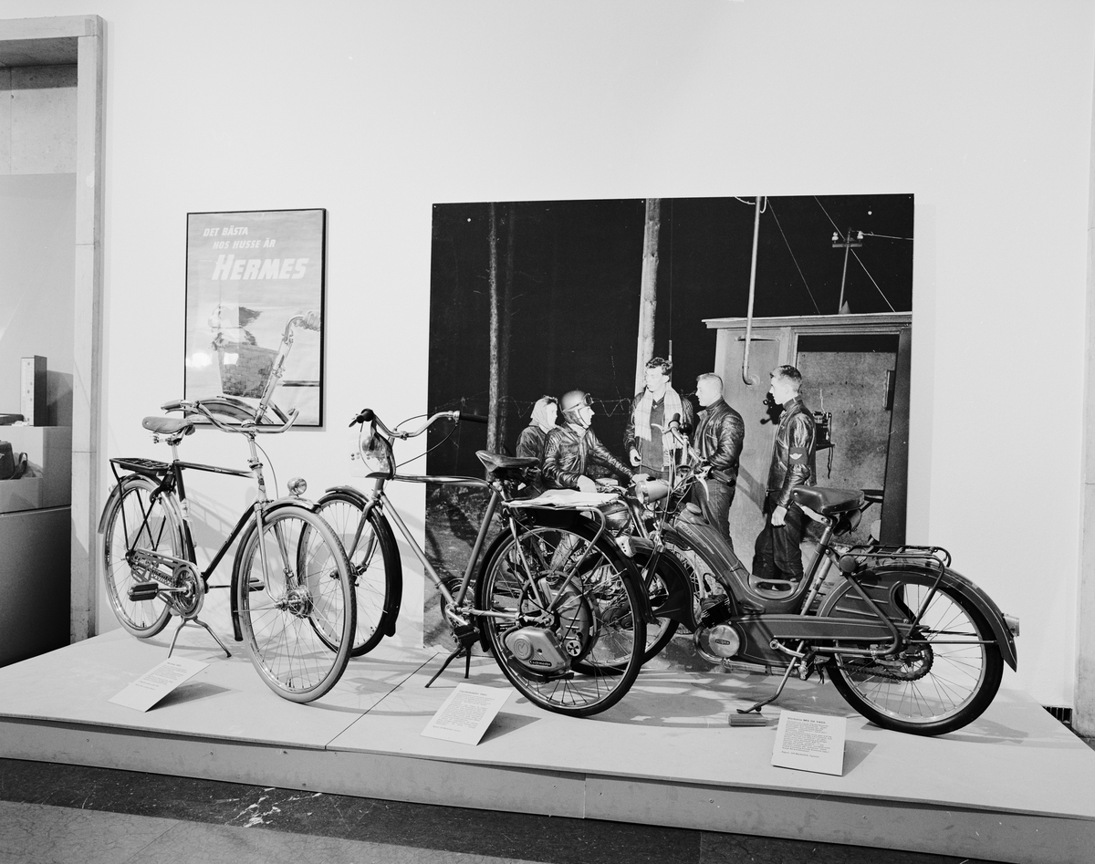 Dokumentation av "Automobilhistoriska klubben" utställningen, Sverige- salen. Viktoria Ms 50, 1955, cykelmoster, 1951, Hermes, 1951 och dockor med 50-tals kläder.