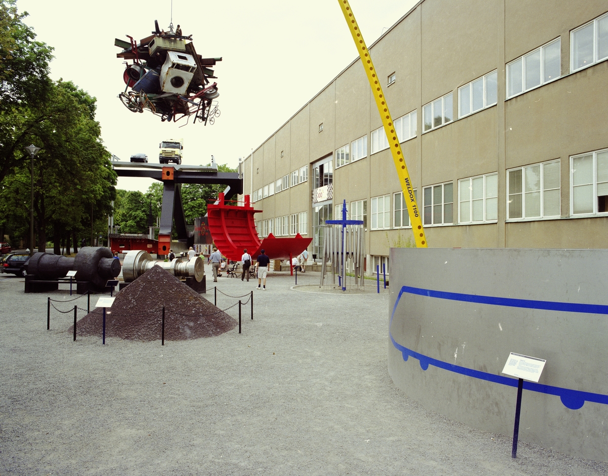 Utställningen "Stålets ansikte". Exteriör. Hela utställningen med labyrint i förgrunden, utanför Tekniska museets entré.
