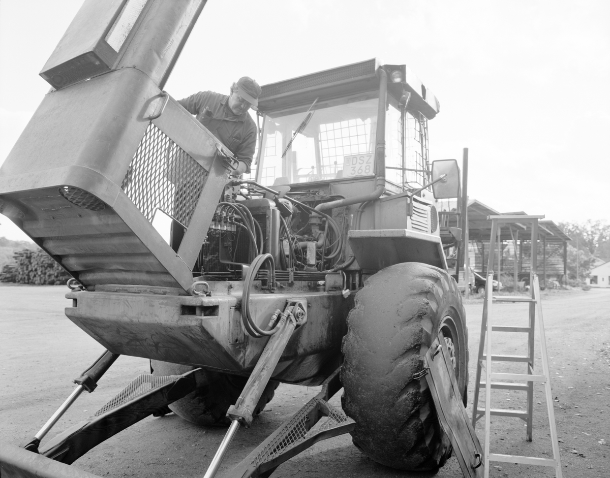 Karl-Erik Nilsson fyller på kylvatten i traktorn.