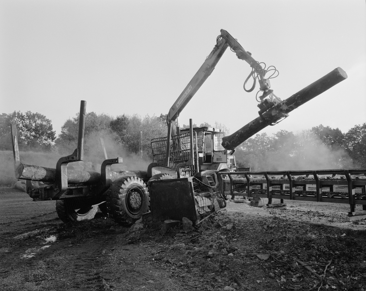 Hantering av uppvärmd stock med skogstraktor. Stocken läggs på barkningsbandet.