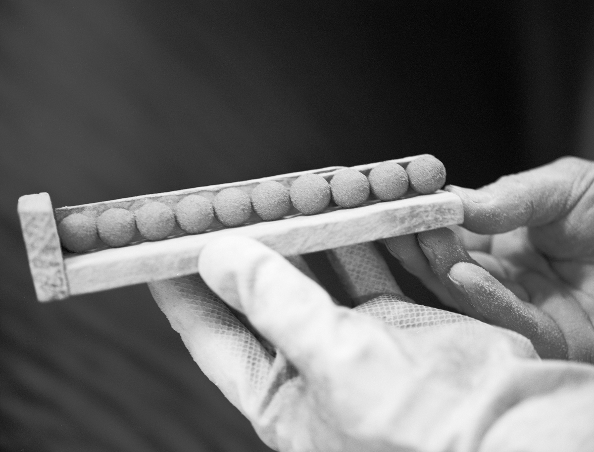 Storleken på kulorna mäts med ett primitivt måttinstrument i trä. När kulorna ryms i måttet har de rätt storlek.