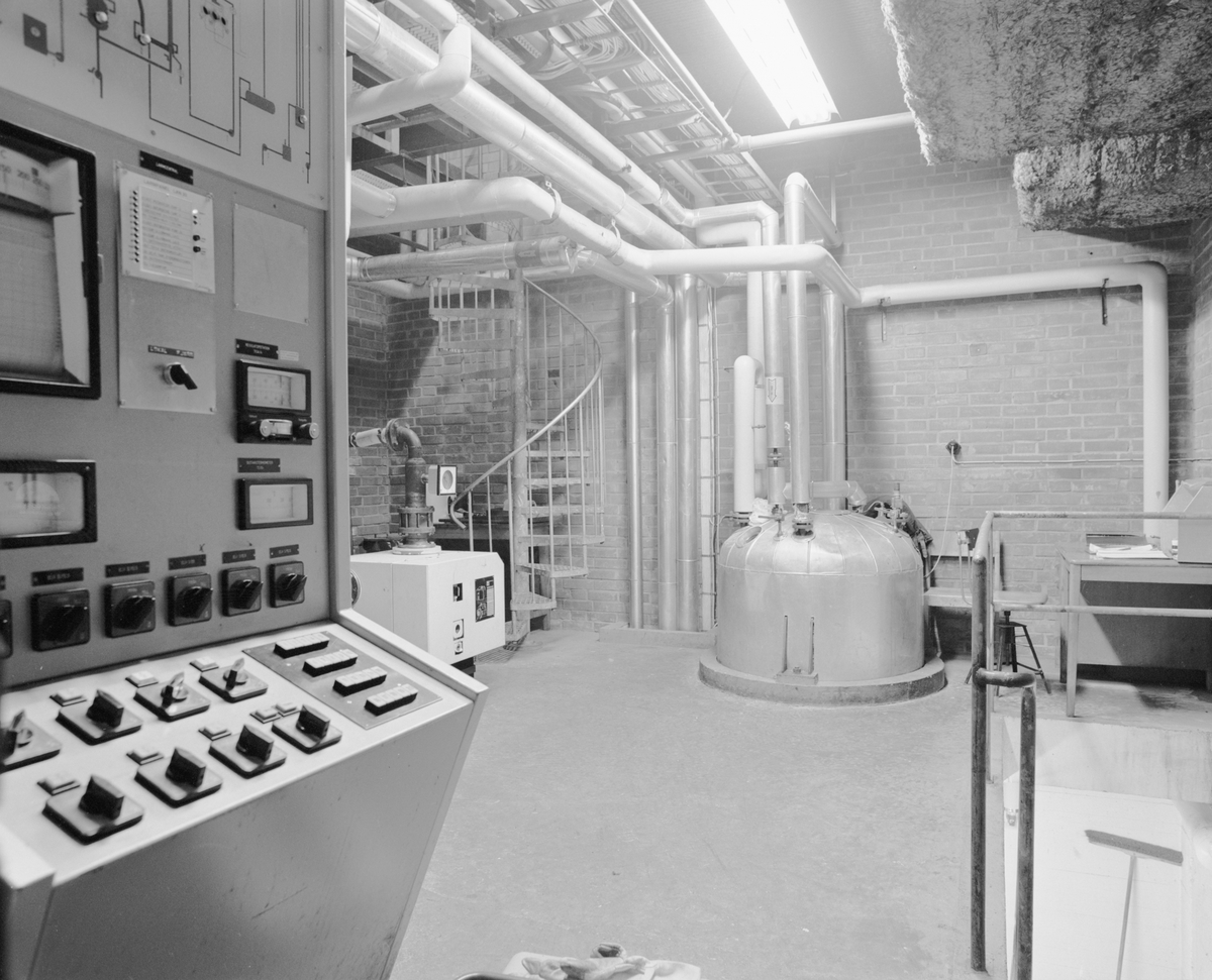 Destillations anläggningen. Manöverpulpet i förgrunden. Tank för färdigdestillerat (ren stearin) i bakgrunden. Färg och smutspartiklar avskiljs.