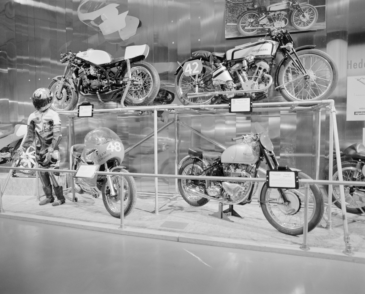 Dokumentation av "Motorcykeln 100 år" i Wallenberghallen. Tävlings-mc på ställ.
