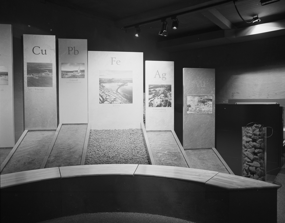 Dokumentation av Gruvutställningen. Sjunde rummet: Gruvdriften i Sverige. Idag brytes Cu (koppar), Pb (bly), Fe (järn), Ag (silver), Au (guld). Bild och text.