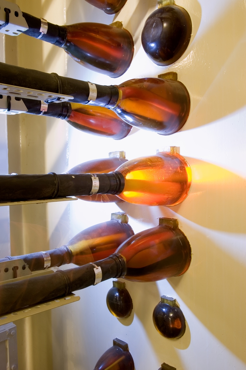 Bilden föreställer: Plan 27 rum 2751. Kabelgenomföringar (starkström) från reaktordelen til KoS-byggnad. Ledningarna splitsades upp och gjöts in i araldit för att få tät och trycksäker genomföring genom plåten. Förklaring av system framgår av rapport :Statens Vattenfallsverk A23/60 5/4 1960.