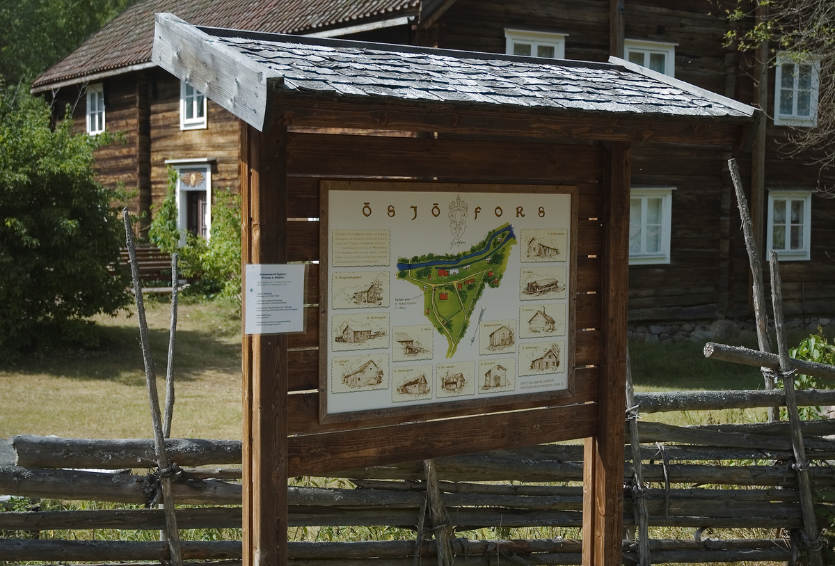 Orienteringstavla över samtliga verksamheter som bedrivits i Ösjöfors, med illustrationer från gamla fotografier.