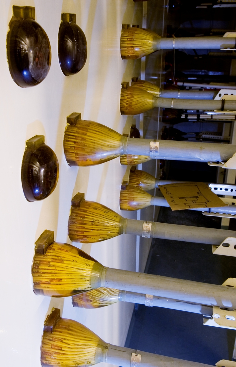 Bilden föreställer: Plan 27 rum 2751. Kabelgenomföringar med styr och kontrollkablar från reaktordelen til KoS-byggnad. Ledningarna splitsades upp och gjöts in i araldit för att få tät och trycksäker genomföring genom plåten. Förklaring av system framgår av rapport :Statens Vattenfallsverk A23/60 5/4 1960.