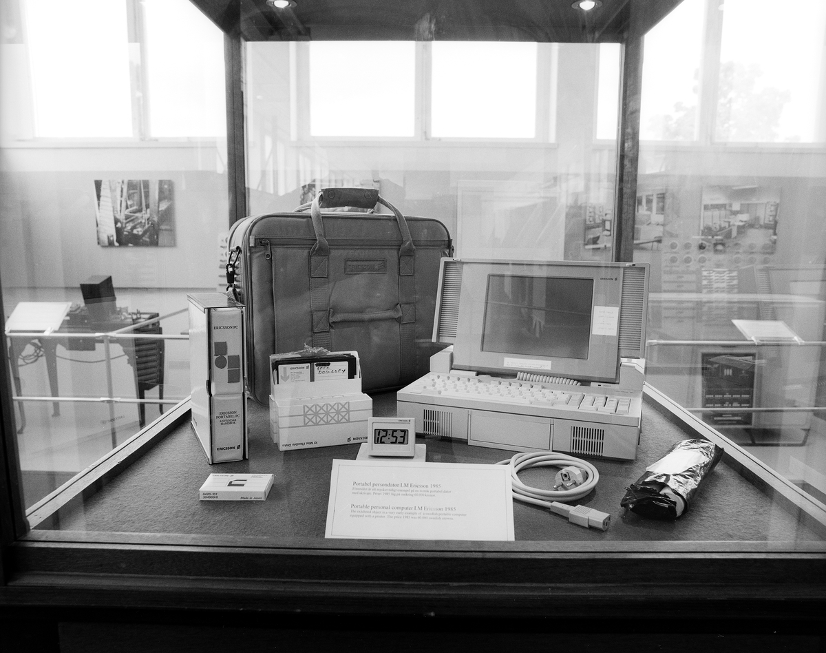 Bild från utställningen "Från kula till dator" tagen i augusti 2001. På bilden syns den bärbara datorn Ericsson 8400-010 och de tillbehör som följde med donationen. (TM41470)