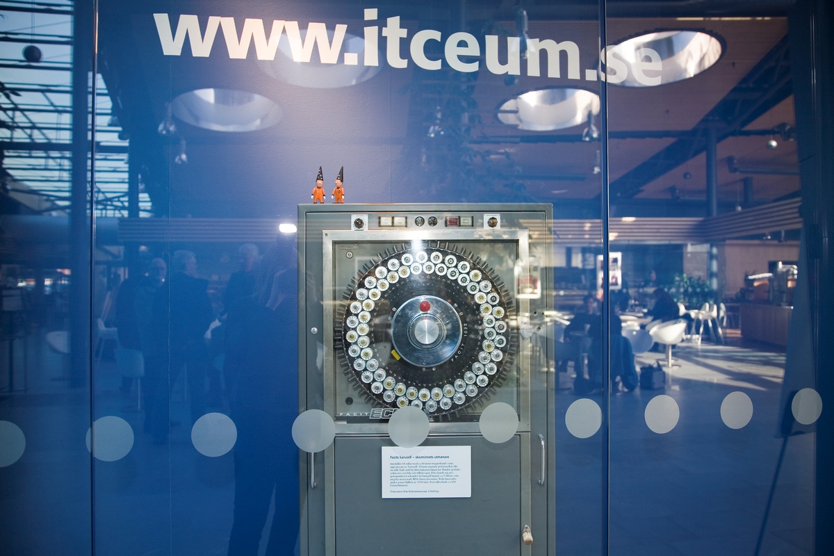Titel: Facit karusellminne på It-ceum i Linköping. Ovanpå karusellminnet står 2 Facit- maskotar.