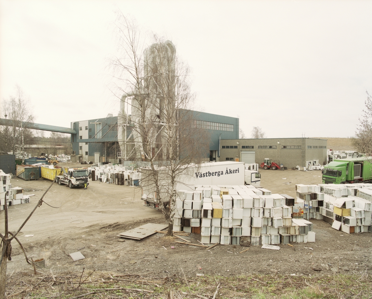 Bildtext:Det blå huset är LÖMAB,1970-talets försöksanläggning för automatisk sopsortering. Soporna kom från sopförbränningsanläggningens sopbunker via transportbandet till vänster i bild. 2004 användes området till att omhänderta kylskåp för återvinning.