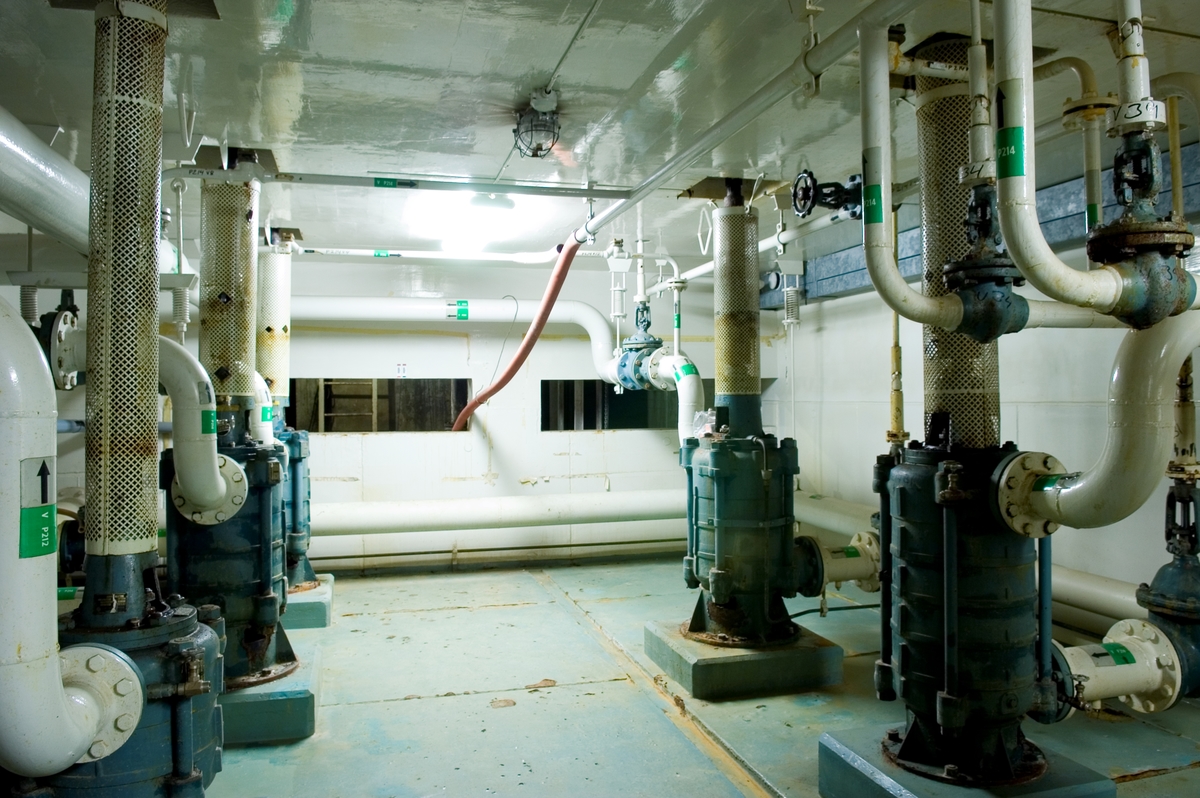 Bilden föreställer: Plan 002 pumprum 001. Kylvattenpumpar. I bortre änden av rummet ligger bergdränagebassängen. Den röda gummiledningen innehåller bergdränagevatten pumpat från rum 0020 i reaktordelen.Till bergdränagebassängen rinner vatten på utsidan av den täta plåten in till en samlingstank i rum 0020 i reaktordelen.Från denna tank pumpas vattnet vidare till bergdränagebassängen i kontroll och ställverksbyggnaden. Denna installation har gjorts efter stationens avställning. Till bergdränagebassängen rinner dessutom bergvatten från reaktor, kontroll och ställverksbyggnaderna som tidigare. En pump som går på nivåvakt och reservpump som startar vid behov, pumpar vattnet via en ledning i kulvert 105 till en plats utanför reningsbyggnaden och vidare i en ledning som slutar utanför inhängat område i ett dike som leder till sjön Orlången. Under drifttiden pumpades vattnet in i reningsbyggnaden och vidare till Sjön Orlången. Förklaring av system framgår av rapport :Statens Vattenfallsverk A23/60 5/4 1960.