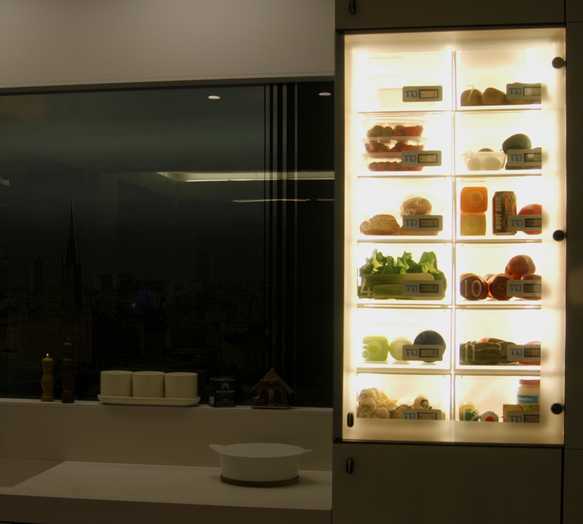 Tänk om. En utställning på Telemuseet om hur det skulle kunna se ut i framtiden i våra hem. I utställningen ingår en film em en familj som skulle kunna tänkas bo i detta hem. Det är ett kök, vardagsrum, sovrum, badrum, uterum och hall. Möbler och teknik som rummen är utrustade med är utvecklat och designat utifrån ett tänkbart framtidssenario. Detta är köket med sitt kylskåp som har hyllor för veckans dagar.