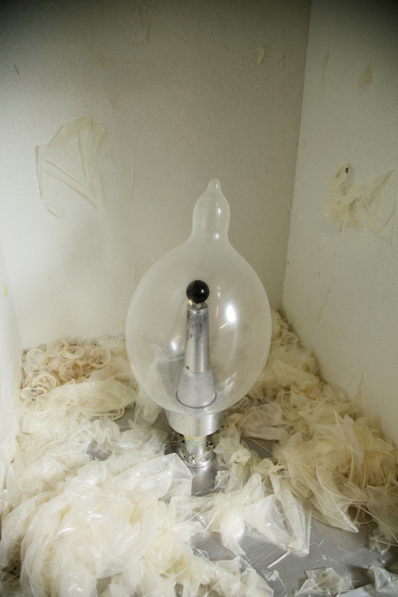 Utställningen 100 innovationer visar de viktigaste innovationerna genom tiderna. Preventivmedlet kondom. Bilden är tagen 2012 på RFSU:s fabrik i Hälsingland. Där testas och förpackas 60 miljoner kondomer per år.