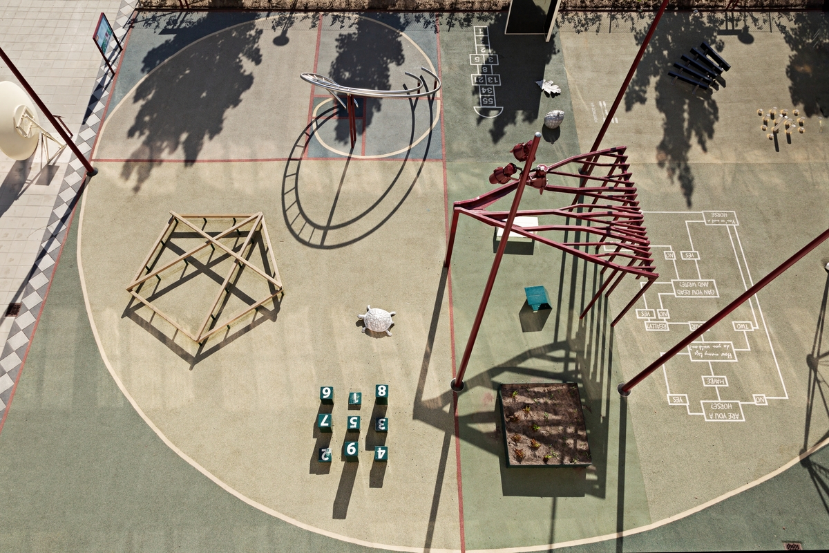 Tekniska museet, exteriör med matematikträdgård, fotograferad uppifrån.
