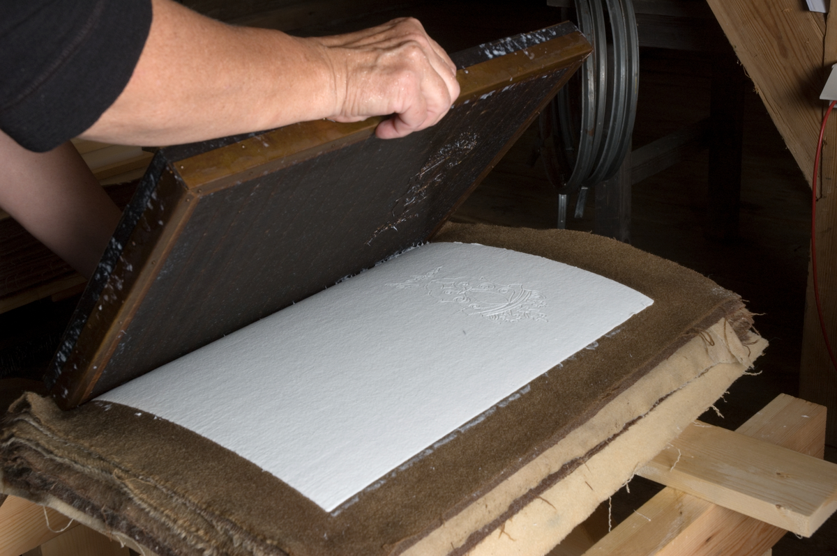 Interiör från pappersmagasinet med utställning om branden och demonstration av papperstillverkning