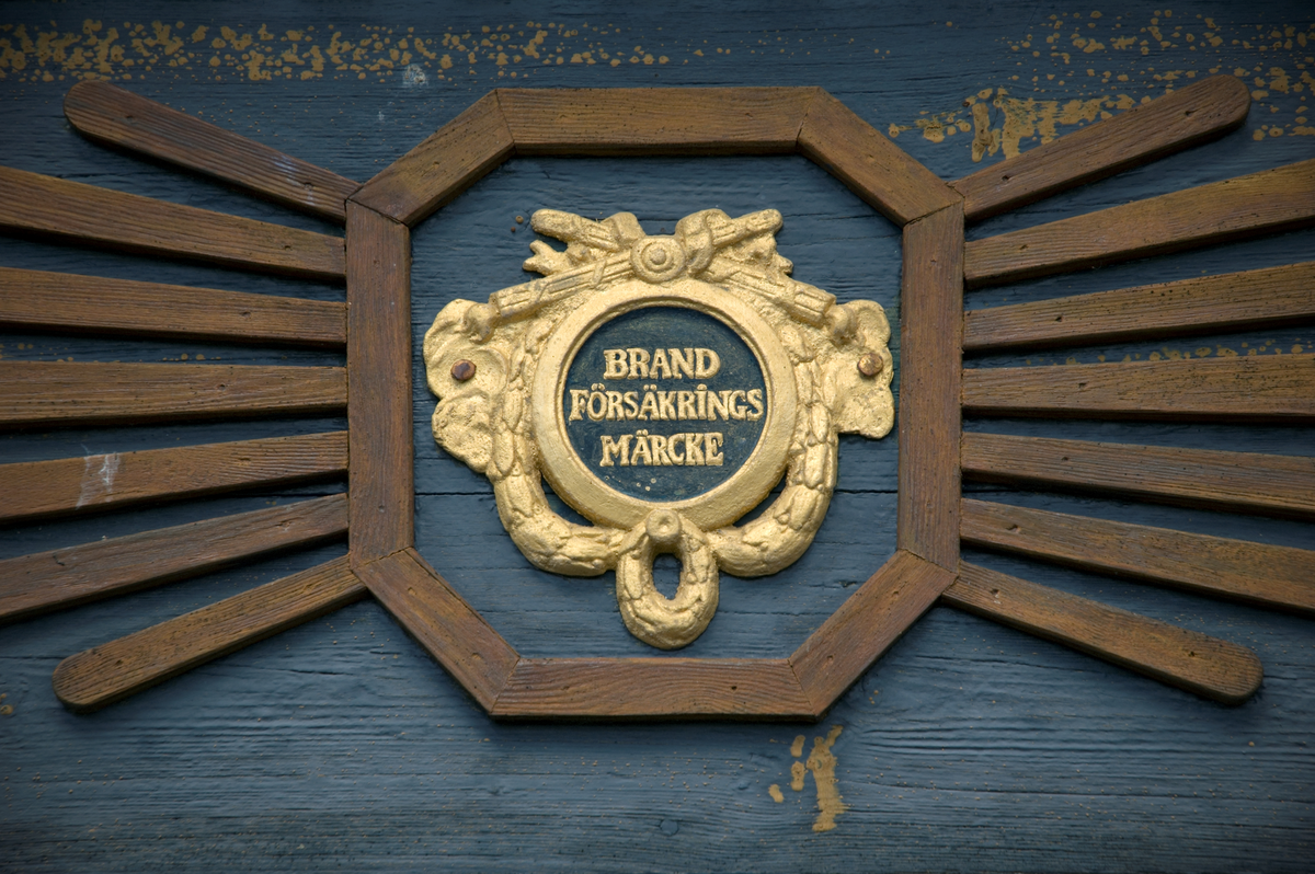 Brandförsäkringsmärke ovanför huvudentré till mangårdsbyggnad