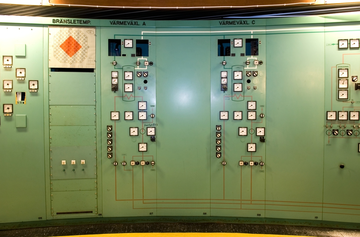 Bilden föreställer: Plan 6, kontrollrum 619. Närbild på reaktorpanel. Från vänster: Bränsletemp, värmeväxlare A samt värmeväxlare C. Förklaring av system framgår av rapport :Statens Vattenfallsverk A23/60 5/4 1960.