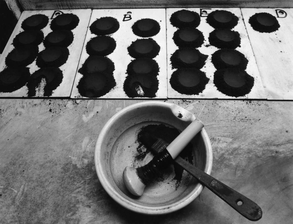 Varje timme tas ett prov av pigmentet från brännugnen. Här ser man hur pulvret mortlas ner och jämförs i kulörerna. Varje skiftlag har sin egen bricka märkt med A-E, skiftets längd är 8 timmar, efter skiftet skall det finnas 8 prov på brickan. När arbetsledaren kommer på morgonen tar han ut en del av sista provet, från varje bricka, som går till samlingsprov för analys. På bilden framgår det att prov är uttagna från bricka D och E.