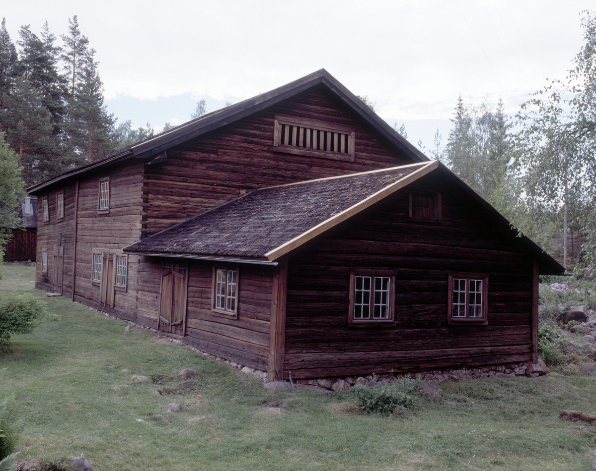 Bruksbyggnaden Ösjöfors handpappersbruk. Bilden tagen i samband med takrenovering av verkstugan, närmast i bild. 1980-tal.